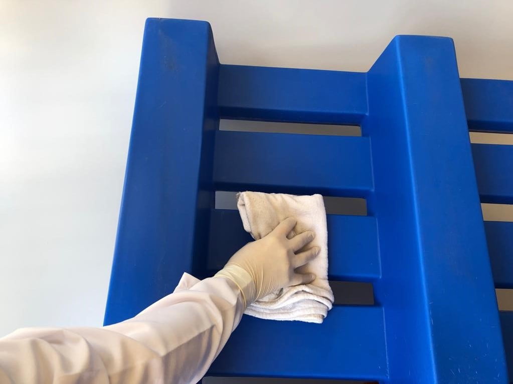 A limpeza e desinfecção de mesas, maçanetas, botões e demais superfícies deve ser reforçada. Para isso, podem ser usados agentes desinfetantes comuns, como o álcool 70% e o hipoclorito de sódio 0,5%.