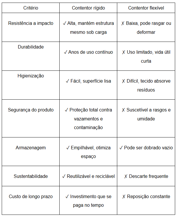 Já os contentores rígidos são a escolha perfeita para ambientes com alto fluxo, necessidade de empilhamento, reutilização frequente e controle de qualidade rigoroso, como nas indústrias químicas, automotivas e alimentícias.