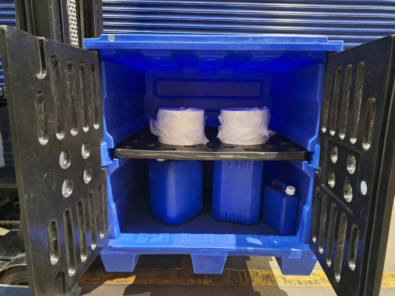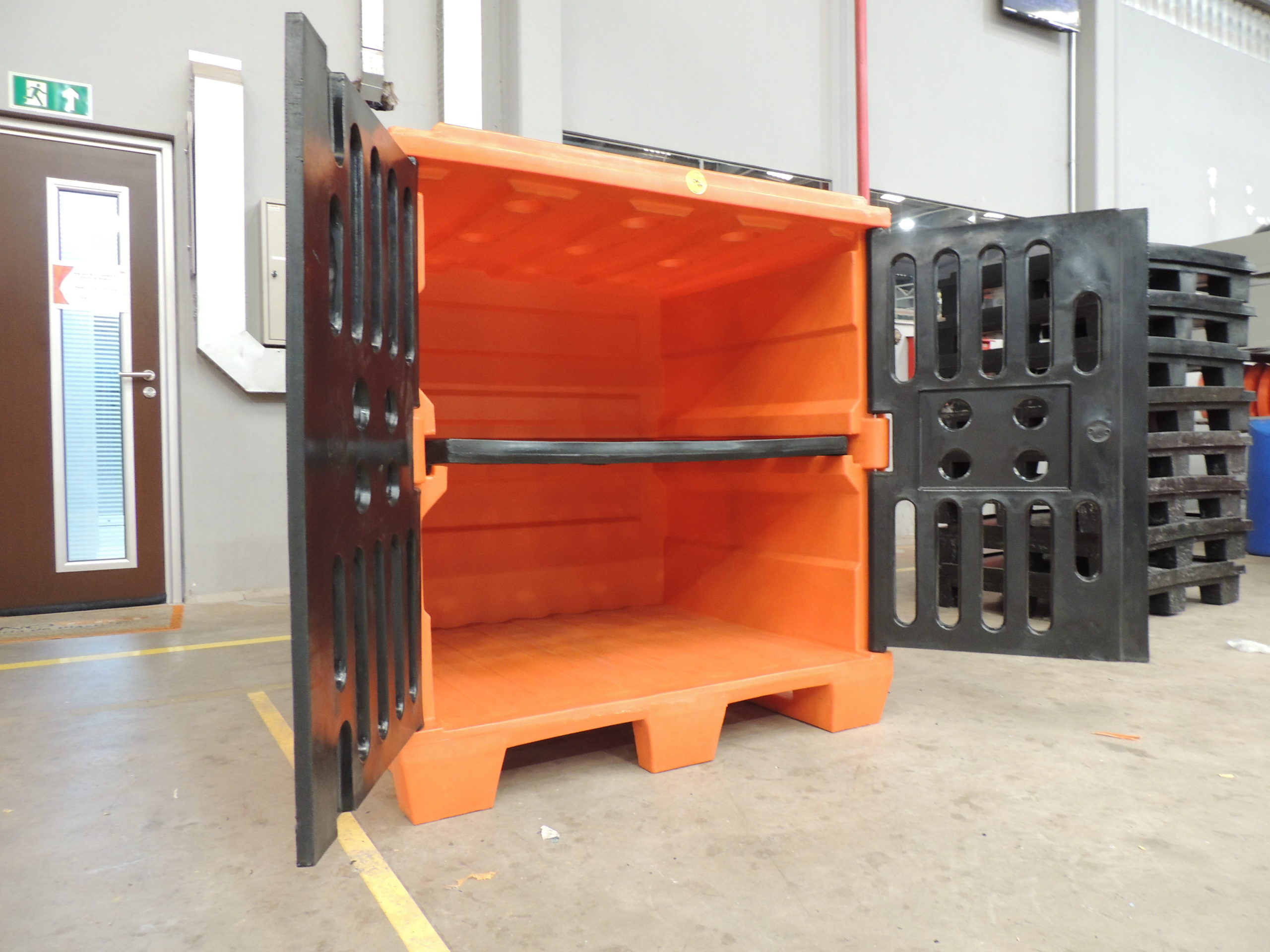 Seu diferencial está nas portas frontais com abertura de 180°, também fabricadas por rotomoldagem, que proporcionam acesso total ao conteúdo interno, facilitando as operações de carga e descarga. O design ventilado da estrutura permite aeração constante e visualização do conteúdo, sem comprometer a rigidez e a integridade do corpo principal, sendo ideal para armazenamento e segregação de insumos.