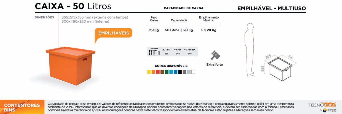 Empilháveis, são produtos extremamente robustos, fáceis de higienizar e livres de manutenção. Não danificam o piso da fabrica. Produzidos em diversas cores e nas versões de 38 a 950 litros, com capacidades de carga que variam de 30 kg até 1000 kg.
