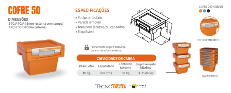 Altamente resistente e imune a agentes químicos. O Cofre de Carga Tecnotri possuí fechos de Inox e alça na tampa, que garantem o fechamento seguro do cofre durante o transporte da carga. Em casos de vazamentos ou derramamentos, não ocorre a contaminação do ambiente nem de outros produtos, pois o material perigoso fica totalmente retido no interior do cofre.