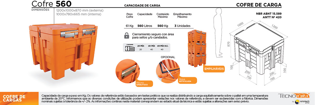 Altamente resistente e imune a agentes químicos. O Cofre de Carga Tecnotri possuí fechos de Inox e alça na tampa, que garantem o fechamento seguro do cofre durante o transporte da carga. Em casos de vazamentos ou derramamentos, não ocorre a contaminação do ambiente nem de outros produtos, pois o material perigoso fica totalmente retido no interior do cofre.