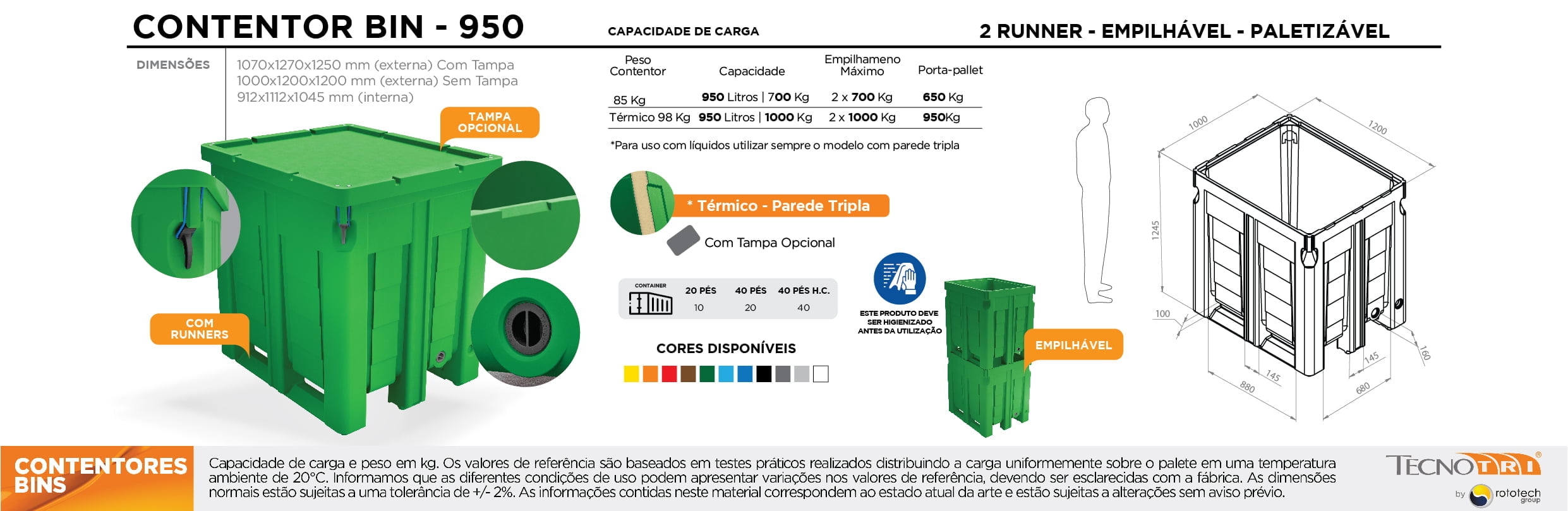 Contentor Bin ou Contentor Plástico Tecnotri é um produto rotomoldado, leve, resistente, de fácil manuseio e higienização. Monobloco, ou seja, sem emendas, pregos ou soldas. Proporciona maior segurança as operações, reduzindo os acidentes de trabalho e gastos com manutenção.