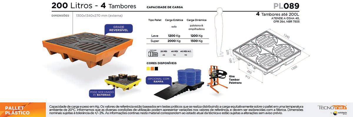 O pallet de contenção, também chamado de dique de contenção e bacia de contenção, possui diferentes formatos e modelos para 1 tambor, 2 tambores e 4 tambores com capacidades variadas de 100L até 1.000L.