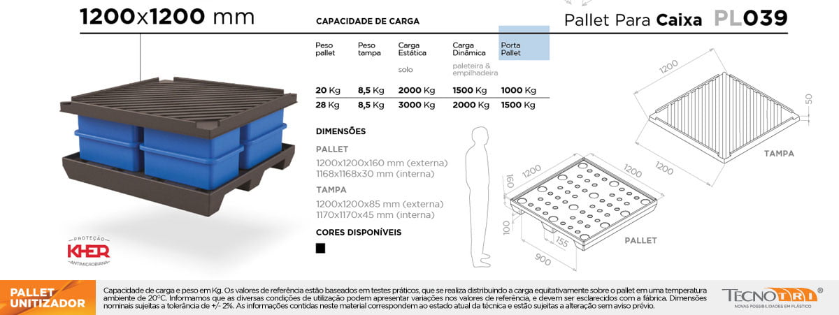 • 1200 x 1200 x 160 mm (externa) – Pallet