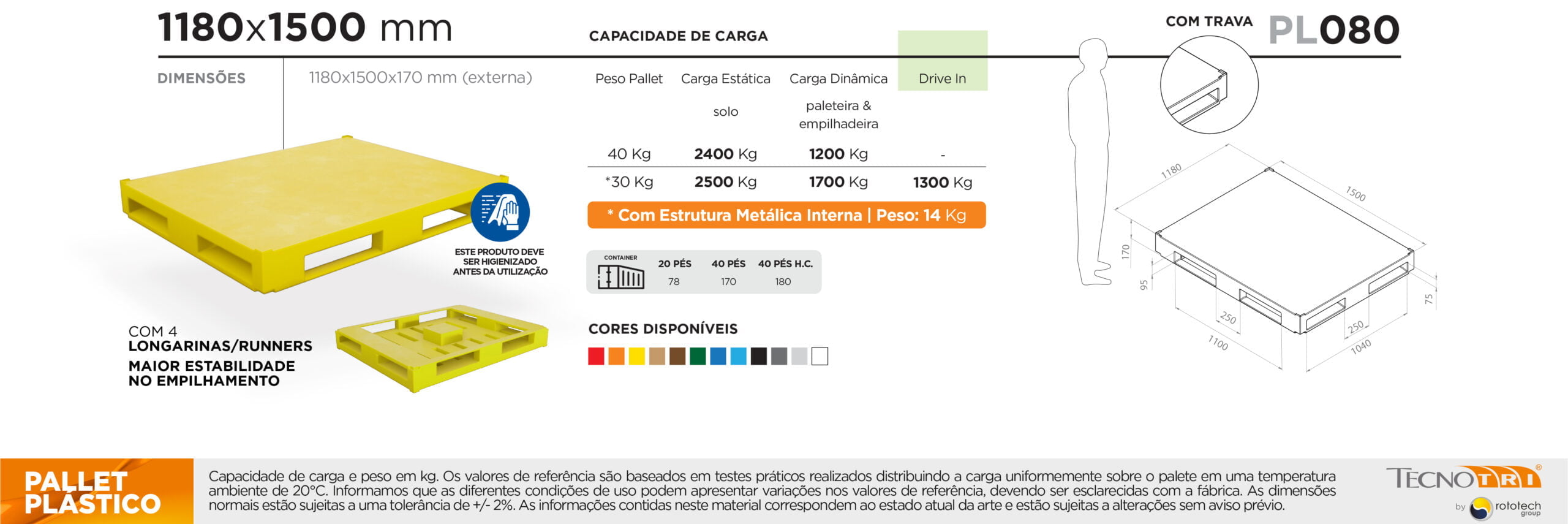 Um fator muito importante na escolha do Pallet Plástico é a capacidade de carga. Existem dois tipos de cargas a serem consideradas a Carga Dinâmica (carga suportada quando o pallet está em movimento na paleteira ou empilhadeira) e a Carga Estática, (carga suportada quando o pallet está apoiado no solo). Uma terceira variante é a capacidade de carga em relação ao sistema de armazenagem que pode ser em Porta Pallet, Drive in e Rack. Veja nas informações técnicas abaixo as capacidades de carga e escolha o pallet ideal para o seu negócio.