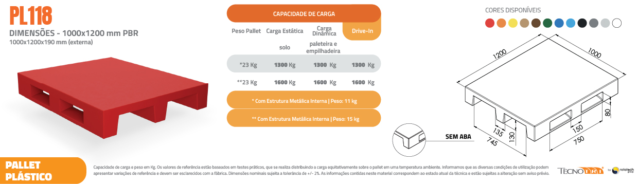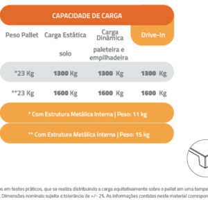 Um fator muito importante na escolha do Pallet Plástico é a capacidade de carga. Existem dois tipos de cargas a serem consideradas a Carga Dinâmica (carga suportada quando o pallet está em movimento na paleteira ou empilhadeira) e a Carga Estática, (carga suportada quando o pallet está apoiado no solo). Uma terceira variante é a capacidade de carga em relação ao sistema de armazenagem que pode ser em Porta Pallet, Drive in e Rack. Veja nas informações técnicas abaixo as capacidades de carga e escolha o pallet ideal para o seu negócio.O pallet desenvolvido especialmente para sua empresa